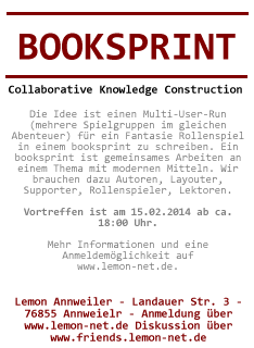 Booksprint kennen viele wahrschenlich nicht. Zum störbern hier mal das empfohlen ansonsten versuche ich mal in eigenen Worten die Idee des booksprint zu fassen. Eine Gruppe von Menschen (6-10) sperren sich eine bestimmte Zeit ins Lemon ein. Das einzige Ziel dass sie haben ist eine super Multi-User-Run-Geschichte zu schreiben und diese in eine ansprechende Form zu bringen (mit Bilder, Layout und und und). Um das Ziel zu erreichen gibt es einige Spezialisten (Layout, Design, Schreiben, Charaktererschaffung). Alles andere wird ausgeblendet (Handy, Störungen durch andere Nutzer) und eine Supporter versorgt die Booksprinter (sorgt für Getränke, macht Essen, spitzt Bleisifte etc.). Es beginnt ein Flow - aus vielen Ideen wird eine Idee und am Ende steht ein fertiges Produkt. Ein Produkt von allen, niemand kann genau sagen von wem es eigentlich ist. Am besten bringen alle ihre eigenen Laptops oder PCs mit (das Lemon kann auch welche stellen). Alle sitzen an einem Tisch und der größte Teil der Arbeit wird in sogenannten Pads erledigt (dort schreiben mehrere Personen gleichzeitig an einem Text). Am Schluss sind alle fertig, müde und das Ding ist fertig. Natürlich möchte ich nicht nur dass wir schreiben, das ganze soll dann auch als Multi-User-Run umgesetzt werden. Alle Schreiber sind potentielle Meister bei einem Run. Das Vortreffen dient zur Abklärung von Terminen, zur Klärung der grundsätzlichen Fragen (welches Rollenspielsystem etc.), zum kennenlernen. Bei der Anmeldung angeben welche Spezialgebiet du übernehmen würdest (Layout, Grafik, Schreiben, Rollenspiel, Support, Lektor oder was ich noch vergessen habe).  Kommentar