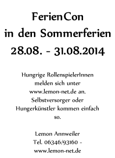 In den Sommerferien soll das Rollenspiel nicht fehlen. Von Donnerstag 28. August bis Sonntag 31. August bieten wir durchgehend eine Convention für Dich an. Gespielt wird was Euch gefällt und für was sich ein Meister und genügend Spieler finden. Neben den Räumlichkeiten, jede Menge Rollenspielmaterialien, Know-How der anwesenden Mitarbeiter und guter Stimmung werden wir für das leibliche Wohl sorgen. Getränke stehen reichlich und gekühlt zur Verfügung und auch an das Essen werden wir denken. Für unsere Planung brauchen wir Deine Rückmeldung. Wann möchtest Du gerne ein fein gekochtes Essen buchen. Bitte bei der Anmeldung den jeweiligen Tag mit angeben, z.B. "Ich Esse am Fr. und Sa. mit.". Handgemachtes und mit viel Liebe gekochte Speis gibt es am Donnerstag (vom Kochteam Aline Dlugosch & Johannes Brück), am Freitag (Chris van Look schwingt den Kochlöffel) und am Samstag (Johannes Petermann verdient sich seine Sterne). Was genau gekocht wird steht noch nicht fest, fest steht aber es wird auf günstige Preise, gute Qualität und ausreichende Menge geachtet. Wer über Nacht bleibt und vor Ort frühstücken möchte kann sich in eine Frühstücksliste vor Ort eintragen - wer dann Brötchen etc. besorgt wird dann ausgemacht. Ohne Anmeldung bist Du auch gerne gesehen (man muss nicht die ganze Zeit da sein - wir freuen uns sogar über Spieler die gelegentlich eine Duschpause einlegen ;-) ), was das Essen betrifft heißt es dann aber "essen was übrig bleibt". Minderjährige die nach den üblichen Jugendschutzzeiten im Jugendhaus bleiben möchten haben unaufgefordert eine Einverständniserklärung Ihrer Erziehungsberechtigten vorzulegen (den Link zum Formular siehst Du links). Erzähle ein bisschen von dem Event herum und schreib in Deine Netzwerke - dann werden sich wieder viele SpielerInnen einfinden. Wir freuen uns schon darauf.