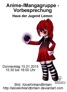 Ich hatte vor Im Jugendhaus eine Anime- beziehungsweise Mangagruppe zu gründen. Dieser Termin stellt eine Vorbesprechung dar, auf der Vorschläge gemacht werden können/sollen. Die Gruppe wird von Johannes Petermann geleitet, welcher von Nicolas Cuvellier unterstützt wird. Eventuell ist geplant, einen Manga selbst zu zeichnen, beziehungsweise einen Anime zu animieren. Zu dieser Sitzung sind alle Interessierten über 15 Jahren herzlich eingeladen. Auf Zahlreiches erscheinen hofft die Orga. Bei Fragen bitte an die Verantwortlichen (Johannes Petermann, Nicolas Cuvellier) wenden.