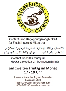 CAFÉ INTERNATIONALKontakt- und Begegnungsmöglichkeit für Flüchtlinge und Mitbürger Das Haus der Jugend Lemon ist offen für die Welt und freut sich mit dem CAFÉ INTERNATIONAL eine Möglichkeit zur Begegnung geben zu können. Jugendliche des Lemon organisieren den monatlichen Treffpunkt. Eingeladen sind Menschen aller Alterstufen - bei Kaffee oder Tee neue Menschen kennenlernen und das Ankommen in einer neuen Heimat leichter machen. Wir freuen uns auf Deinen Besuch - informiere Deine Freunde und Bekannten (viele möchten die Neuankömmlinge Willkommen heißen, wissen aber nicht wie - hier gibt es eine einfache Möglichkeit).