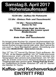 SOWOHL DER FLOH- UND TAUSCHMARKT, WIE AUCH ALLE VORSTELLUNGEN SIND KOSTENLOS! WIR FREUEN UNS AUF EUCH UND HOFFEN AUF GANZ VIELE BESUCHER DES BASARS UND ZUSCHAUER BEI DEN VORSTELLUNGEN. Kommentar
