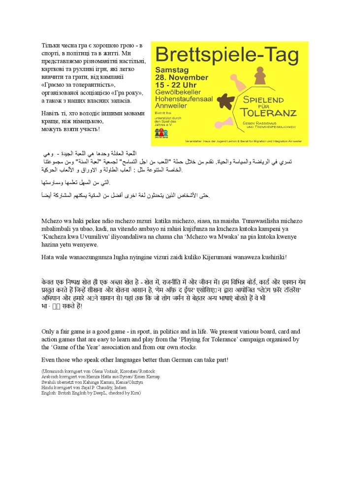 Nur ein faires Spiel ist ein gutes Spiel, das gilt im Sport, in der Politik und im Leben. Wir, das Haus der Jugend Annweiler und der Rat für Migration und Integration der Stadt Annweiler präsentieren aus der Aktion „Spielend für Toleranz“ des Vereins „Spiel des Jahres“ und aus eigenen Beständen verschiedene Brett-, Karten und Aktionsspiele, die einfach zu lernen und zu spielen sind. Auch wer andere Sprachen besser spricht als Deutsch, kann mitmachen! Alle Altersstufen sind eingeladen!