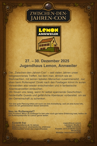 Rollenspiele, sondern auch das System, das im Lemon am häufigsten gespielt wird. Wir verfügen im Lemon über eine umfangreiche Sammlung an Regelwerken und Abenteuern - hier wirst du bestimmt finden wenn du Informationen brauchst. Wir organisieren für dich und deine Freunde auch gerne Einführungsrunden in das Spielsystem. Komme einfach auf den offenen Rollenspieltag (jeder zweite Samstag im Monat ab 12 Uhr) oder wende dich an den Jugendhausleiter oder einen der Ehrenamtlichen.