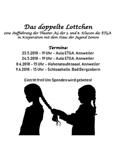 Aline Dlugosch und Chris van Look bieten im Rahmen einer AG für SchülerInnen der 5., 6. und 7. Jahrgangsstufe des TGA eine AG an. Beginn jeweils 14 Uhr im MSS-Haus. Gespielt wird das Stück "Das doppelte Lottchen". Wir planen mehrere Auftritt. Kästner, Erich In einem Ferienheim stehen sich plötzlich zwei kleine Mädchen gegenüber, die sich gleichen wie ein Ei dem anderen. Luise Palfy aus Wien hat lange Locken und Lotte Körner aus München geflochtene Zöpfe, das ist aber wirklich der einzige Unterschied. Luise und Lotte beschließen dem Geheimnis ihrer Ähnlichkeit auf den Grund zu gehen: So fährt Luise nach den Ferien als Lotte nach München und Lotte als Luise nach Wien.