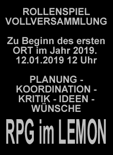 Jeden zweiten Samstag im Monat ist das Jugendhaus offen für Rollenspieler und welche die es werden wollen. Alle Altersgruppen sind so herzlich dazu eingeladen außerhalb ihrer festen Runde zu spielen, die Bücher zu wälzen, Rollenspiel erstmal kennenlernen und sich anzuschauen oder einfach neue Leute, Systeme und Rollenspielarten kennen zu lernen. Als Altersempfehlung geben wir für ORT 12 Jahre an und für den ORN 14 Jahren. Zu Beginn des Jahres 2019 (am ersten ORT am 12. Januar 2019) laden wir zur Vollversammlung der RollenspielerInnen ein. Pünktlich um 12 Uhr beginnt die Besprechung. Was soll im neuen Jahr alles angepackt werden, welche Wünsche haben die RollenspielerInnen, wie wird es organisiert und wer organisiert es und und und ... . Wir wünschen uns möglichst viele Teilnehmer der Vollversammlung, viele Ideen und eine engagierte Diskussion.