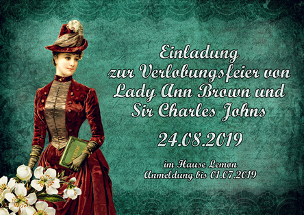 Verlobungsfeier von Lady Ann Brown und Sir Charles JohnesLARP = Live Action Role Playing = Live Rollenspiel Wir - Hannah, Mara und Chris - organisieren für Euch ein Live-Rollenspiel im Jugendhaus. Verfolge hier unsere aktuelle Planung und melde dich an bevor andere dir den Platz wegschnappen. Einlass ab 18 Uhr - Spielbeginn gegen 19 Uhr. Sir Brown, der Vater von Lady Ann lädt zum Verlobungsfeier seiner Tochter mit Sir Charles Johnes ein. Wir spielen im viktorianischen Zeitalter, in den 1850er Jahren. Das Ganze spielt sich in London ab. Eine kleine Feier mit Freunden und der Familie. Eine der Rolle und der Zeit entsprechende Gewandung wird erwartet.