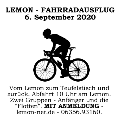 Fahr mit uns gemeinsam Fahrrad, wir fahren gemeinsam zum Teufelstisch nach Hinterweidenthal. Um 10 Uhr geht es los, wir begleiten zwei Gruppen. Eine Gruppe mit denen die flotter fahren möchten und eine Gruppe die lieber langsam unterwegs sein möchten (auch für Fahrradanfänger). Für die Teilnahme ist eine Anmeldung notwendig (entweder hier auf der Internetseite, im Lemon oder per Telefon 06346.93160). Beim Ausflug ist ein Mindestabstand von 1,5 Meter einzuhalten und für die Besichtung des Teufelstisches die Mund-Masken-Bedeckung nicht vergessen. Wir empfehlen allen einen Helm aufzusetzen. Für Getränke und Verpflegung hat jeder selbst zu sorgen. Achtet darauf, dass euer Fahrrad in Ordnung ist.