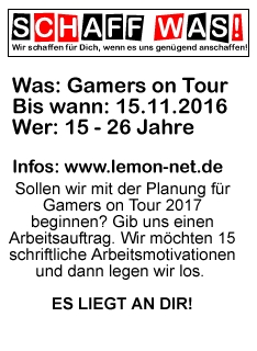 Gamers on Tour ist ein Rollenspielwochenende im Pfälzer Wald. In einem Selbstversorgerhaus von Freitag bis Sonntag. Gemeinsam Spass haben, gemeinsam Kochen, gemeinsam Paper&Pen Rollenspiele spielen und ein gemeinsames Live-Rollenspiel. Kostenpunkt um die 40 Euro. Die Veranstaltung würde im Jahr 2017 stattfinden. Wir sollen mit der Arbeit beginnen? Sobald wir 15 schriftliche Arbeitsaufforderungen von Menschen im Alter von 15 bis 26 Jahren erhalten haben legen wir los. Wir geben Euch dafür bis zum 15. November 2016 Zeit. Deine Arbeitsaufforderung an uns kannst Du per E-Mail an Inge schicken (inge.imhoff[at]lemon-net.de) oder per Brief an Inge Imhoff | c/o Lemon Haus der Jugend | Landauer Str. 3 | 76855 Annweiler. Bitte schreibe Deinen Namen, Dein Geburtsdatum, eine Kontaktmöglichkeit und mit welcher Arbeit wir beginnen sollen (also hier GoT) in Dein Schreiben. Gerne kannst Du uns noch schreiben warum Dir die Veranstaltung wichtig ist, welche Wünsche Du hast oder eine schöne Idee für das nächste GoT. Zu viel Arbeit für Dich? Wenn es nicht so wichtig ist, dann spar Dir die Mühe - dann kann es aber sein, dass es kein GoT gibt.Gamers on Tour!