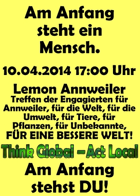 Wir müssen etwas tun - wir müssen etwas für unsere Zukunft tun! Du möchtest etwas machen, Du möchstest unsere Welt besser machen? Think Global - Act Local Ich möchte mit Euch an der Idee eines besseren Annweilers, ich möchte mit Euch an der Idee einer besseren Welt arbeiten! Komm zum ersten Treffen - am Anfang jeder Verbesserung steht der Mensch, stehst Du! Du bist nicht alleine - andere denken wie Du, lass uns anfangen!