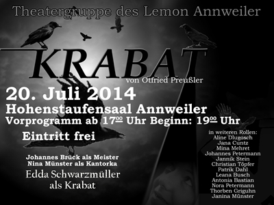 von Otfried Preußler Die Theatergruppe des Lemon bringt Krabat auf die Bühne des Hohenstaufensaal. Am Sonntag den 20. Juli um 19 Uhr beginnt die Vorstellung. Krabat, gespielt von Edda Schwarzmüller, wird als Mühlknappe (Lehrling auf einer Mühle) aufgenommen. Langsam merkt er aber, mit der Mühle und dem Müller stimmt etwas nicht. Krabat ist eine unheimliche Geschichte - komm zur Aufführung und erlebe eine unheimliche Geschichte, voller Magie und Liebe.