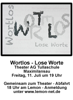 Wir besuchen die Theater AG der Tullaschule Maximiliansau bei der Vorführung des Stücks "Wortlos LoseWorte". Die Fahrtkosten mit dem Jugendbus der Kreisverwaltung übernimmt das Jugendhaus, den Eintritt zum Theaterstück (wieviel es kostet ist mir noch nicht bekannt) übernimmt jeder selbst. Ich bitte um Voranmeldung. Sollten alle Plätze frühzeitig belegt sein würde ich versuchen noch alternative Fahrmöglichkeiten zu erschließen.