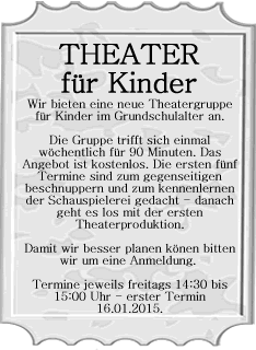 Wir bieten eine neue Theatergruppe für Kinder im Grundschulalter an. Die Gruppe trifft sich einmal wöchentlich für 90 Minuten. Das Angebot ist kostenlos. Die ersten fünf Termine sind zum gegenseitigen beschnuppern und zum kennenlernen der Schauspielerei gedacht - danach geht es los mit der ersten Theaterproduktion. Damit wir besser planen könen bitten wir um eine Anmeldung. Termine jeweils freitags 14:30 bis 15:00 Uhr - erster Termin 16.01.2015.