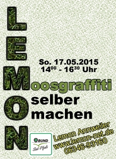 Wir machen uns ein eigenes Moosgraffiti. Wie das ganze funktioniert kannst Du mit uns gemeinsam am Sonntag den 17. Mai ab 14 Uhr erleben. Wie sowas aussieht kannst Du hier schon sehen. Der Moosgraffiti Workshop kostet Dich nichts - bitte melde Dich trotzdem an, für uns ist das immer sehr viel übersichtlicher. Ebenfalls wieder am Start wird Jenni vom BUND sein.
