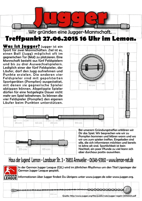 Jugger, das bedeutet zwei Teams die um einen Hundeschädel aus Schaumstoff kämpfen. Mit sogenannten Pompfen bewaffnet versuchen vier SpielerInnen ihre unbewaffneten LäuferIn bis zum gegnerischen Mal (Tor) durchbringen. Nur die LäuferIn darf den Schädel aufnehmen und punkten! Auf den Grundungstreffen stellen wir Dir das Spiel vor. Wir klären wie wir zu Pompfen kommen, wo wir spielen können und wann wir uns treffen.