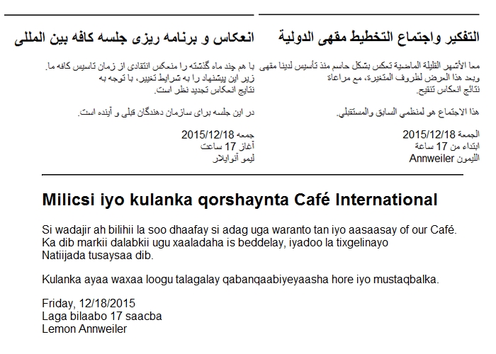Gemeinsam die letzten Monate seit der Gründung unseres Cafés kritisch reflektieren. Im Anschluss das Angebot auf die veränderten Bedingungen unter Berücksichtigung der Reflexionsergebnisse überarbeiten. Eingeladen sind alle die bei der Organisation und der Umstetzung des Café International beteiligt waren. Eingeladen sind jedoch auch alle, die sich noch mit einbringen wollen. Nach der Reflexionsrunde können / dürfen / sollen gerne noch anderen Themenbereiche im Zusammenhang mit Migration / Lemon besprochen werden.