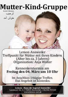 Die Mutter-Kind-Gruppe richtet sich besonders auch an junge Mütter, die erst seit kurzem in Annweiler sind. Für die Kinder und Mütter mit Flüchtlingshintergrund eine gute Möglichkeit neue Kontakte zu knüpfen und Deutsch zu lernen. In gemütlicher Runde können pädagogische Fragen aus dem Lebensalltag mit kleinen Kindern besprochen werden. Erster Termin zum Kennenlernen ist am Freitag den 04. März von 10:00 bis 11:30 Uhr im Lemon Annweiler. Danach wird die Gruppe sich alle 14 Tage treffen. Für nähere Informationen steht Christian van Look vom Jugendhaus zur Verfügung (Telefon 06346-93160).