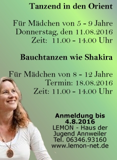 Eine Tanzreise in den Orient........... auf dem fliegenden Teppich reisen wir in die Märchenwelt von 1001 Nacht. Dort lernen wir den Bauchtanz kennen und treffen viele Märchengestalten Für Mädchen von 5 - 9 Jahre Donnerstag, den 11.08.2016 Kursleitung: Anke Leupold