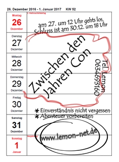 Nach altbewährter Tradition findet auch dieses Jahr wieder die "Zwischen-den-Jahren-Con" statt. Grundsätzlich ist die "Zwischen-den-Jahren-Con" eine sehr entspannte Con, an der wir noch einmal einfach das Leben genießen, die restlichen Weihnachtsplätzchen essen, um endgültig zu platzen und das Jahr ausklingen lassen. Mit dem Essen werden wir sehen, wie sehr der Andrang ist. Da wir ja unter der Woche spielen, könnte man auch einfach etwas zum kochen kaufen und gemeinsam kochen. Oder wir machen es so, dass sich jeder selbst etwas zu essen sucht. Damit auch nicht alle Arbeit auf den Ehrenamtlern lastet bitte ich auch einfach um kleine Mithilfe der anwesenden. Mal den Teller wegbringen, Spülen oder kochen, das dürfte ja bei allen drin sein. Dann wird es mit etwas Arbeitsteilung auch für alle entspannter. Denkt aber daran, dass das Mitbringen von Getränken ins Jugendhaus nicht erlaubt ist! Um unsere Planung etwas zu vereinfachen, kannst du gerne einen Kommentar unter diesem Angebot verfassen – dafür musst du dich nur anmelden – und kannst uns ganz unverbindlich mitteilen, ob und wann du kommst. Da bleibt mir ja nur noch zu hoffen, dass einige von euch erscheinen werden. Ich wünsche uns dabei schon einmal viel Spaß im Voraus und für alle, die diesen Eintrag vor Weihnachten lesen: Ein Frohes und gesegnetes Fest. Und an, wie immer besonders wichtig (!): Die Minderjährigen bitte an die Einverständniserklärung denken, dass ihr noch nach 24 Uhr im Jugendhaus sein könnt !!!